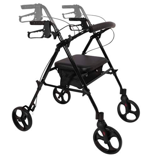 The stylish ProBasics deluxe height-adjustable aluminum rollator features a unique design allowing the user to adjust the seat and handle height to their specifications for maximum comfort and universal fit (adjusts from junior to adult size with one rollator) * This lightweight rollator feature easy-to-operate ergonomic hand brakes and 8-inch wheels for great maneuverability and stability * A seamless padded flip-up seat with zipper compartment and large nylon storage pouch keep belongings private and protected * Ergonomic handles with loop-style brakes are adjustable in one inch increments from 30 to 38 with self-threading knob * Height adjustment on frame allows seat height to be adjusted in one-inch increments from 18 to 22 * Comes with a padded flip-up seat with zipper pouch for storage of personal items and added security * Additional roomy and convenient storage pouch attaches to frame easily and keeps larger belongings protected * Removable padded curved backrest is equipped with a hinge so it can flip up for easy storage * 8-inch non-marring black wheels with soft grip tires glide on almost any surface * Lightweight aluminum frame is durable for years of worry-free use * Folds up easily for easy transport and storage * Overall Width: 23 (W) * Seat Dimensions: 14 (W) x 12 (D) * Adjustable Seat Height: 18 to 22 * Patient Height Range: 4?11 to 6?4 * Weight Capacity: 300 lb * Adjustable Handle Height: 30 to 38 * Wheel Size: 8 * Product Weight: 14 lb * Carton Dimensions: 31.5 x 7.5 x 24.6 * Shipping Weight: 19 lb * Limited lifetime warranty on frame *